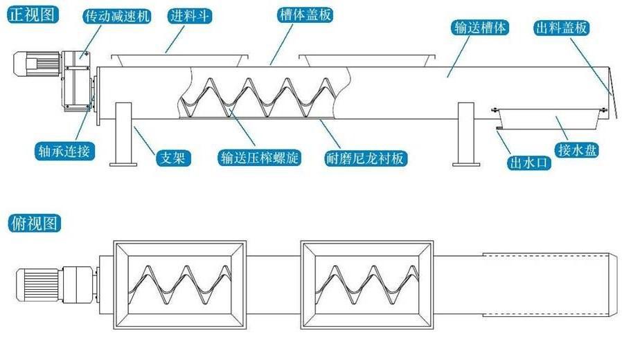 該壓榨機(jī)輸送壓榨殼體采用U型槽式結(jié)構(gòu),上部封蓋板,為增加出料高度,一般為平送出料。 壓榨螺旋采用無軸螺旋,下襯耐磨尼龍襯板,增加了輸送長度,壓榨部分為平送壓榨結(jié)構(gòu)。 可同時(shí)接受多臺格柵出料,輸送加壓榨一體,減少了動(dòng)力消耗及設(shè)備投資。